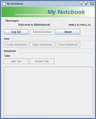 To start using My Notebook download and extract the My Notebook distribution ZIP file to your computer. The My Notebook application will run on Windows, Linux, or Mac OS. The Java runtime must be installed on your computer to run the My Notebook application. On Microsoft Windows, double click the My Notebook.jar file and the application should start. The application can also be started from the command line with the command 'java -jar MyNotebook.jar'